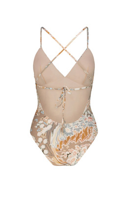 The One-Piece Lace V-Neck Swimsuit is a sophisticated piece that embodies the nomadic and sensual elegance of the Miss Bikini Luxe SS26 collection.