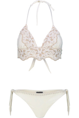 The triangle top in two-tone broderie anglaise lace wraps the silhouette with a sophisticated and slightly textured effect, while the regular briefs with adjustable laces guarantee a perfect fit.
